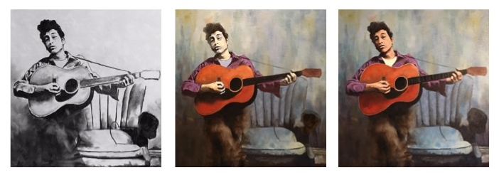 This series of photographs shows the progression of work on this painting. I am not sure that the final image is of the finished work, but if not, it is pretty close to final. I painted this from a black and white photograph. After finishing the painting and while looking for more Dylan photographs on-line, I actually found a color version of the photograph. This particular painting hangs in my home office in a really nice frame that is reminiscent of a 1960's vibe. I am a big Dylan fan - I painted this before he won the Nobel Prize.