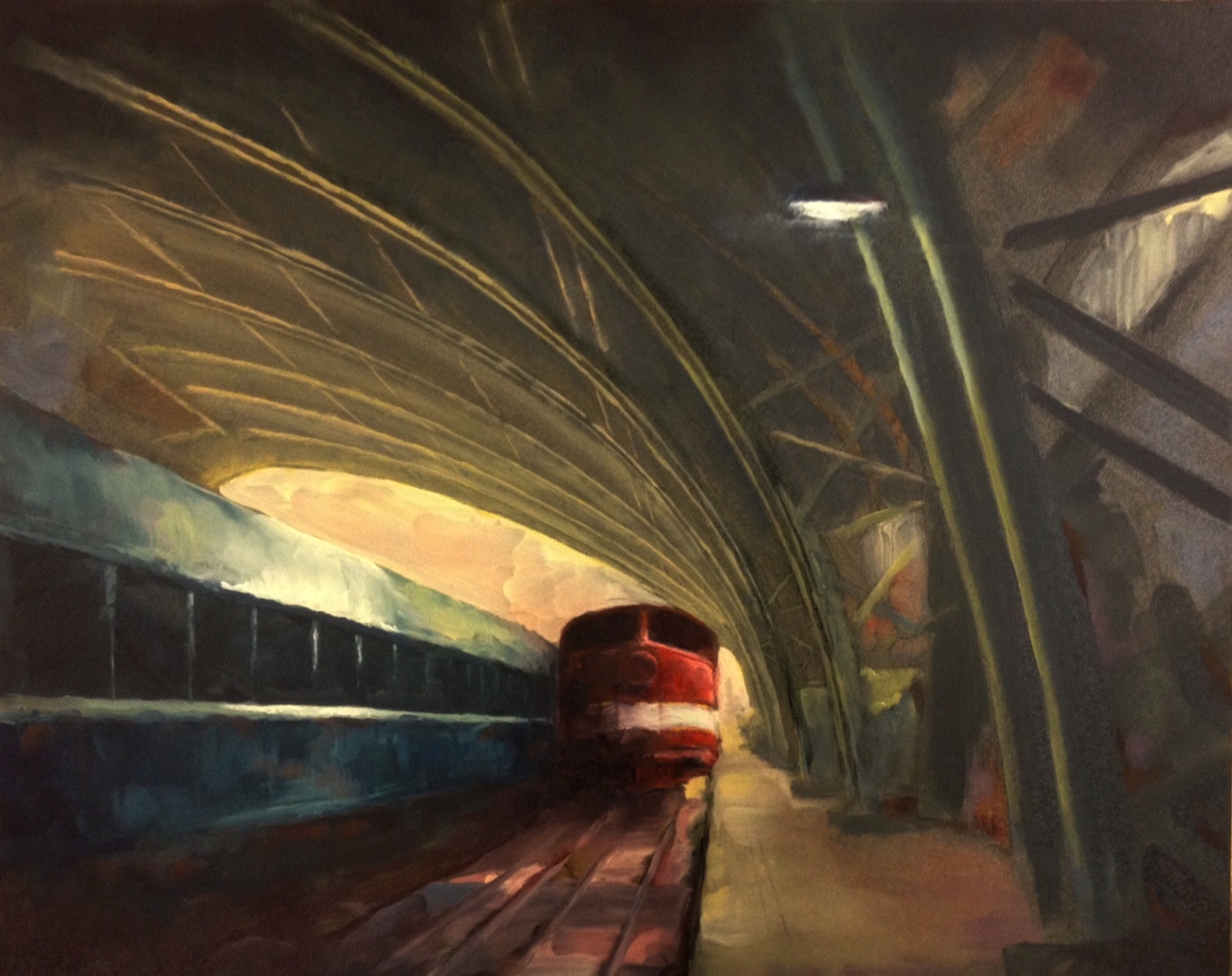 This painting is from a black and white photograph inside the Reading Terminal in Philadelphia. I used to commute to work through this terminal in the early 1980's. Reading Terminal is no longer in active service, but instead is now part of the convention center in downtown Philadelphia. I was at a workshop there in September 2016 and I went and stood at the spot where the photograph was made that was used as the basis for the painting.