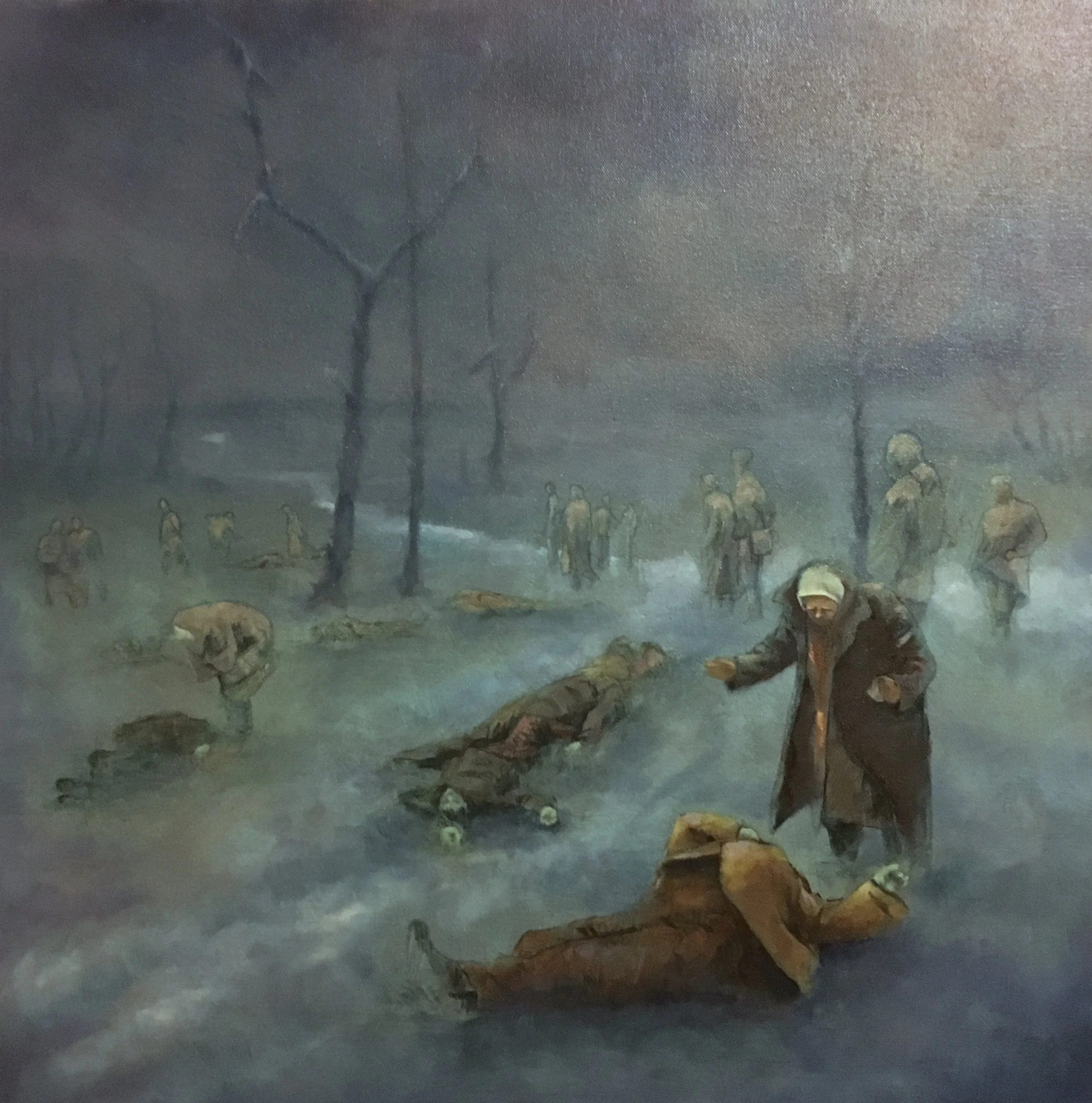 This is still a work in progress. Again, this painting is based on a black and white photograph. The photograph is truly haunting - the landscape is barren, and the dead litter a foreground that is an amalgam of snow and mud. I debated whether I should even use the photograph as the foundation for a painting. The colors of this painting are not reproduced correctly in the photograph shown here, but the colors shown here capture the mood much better than what I actually painted. I added the trees to the composition, twisting and shattering them to reflect the anguish of the living and the dead.