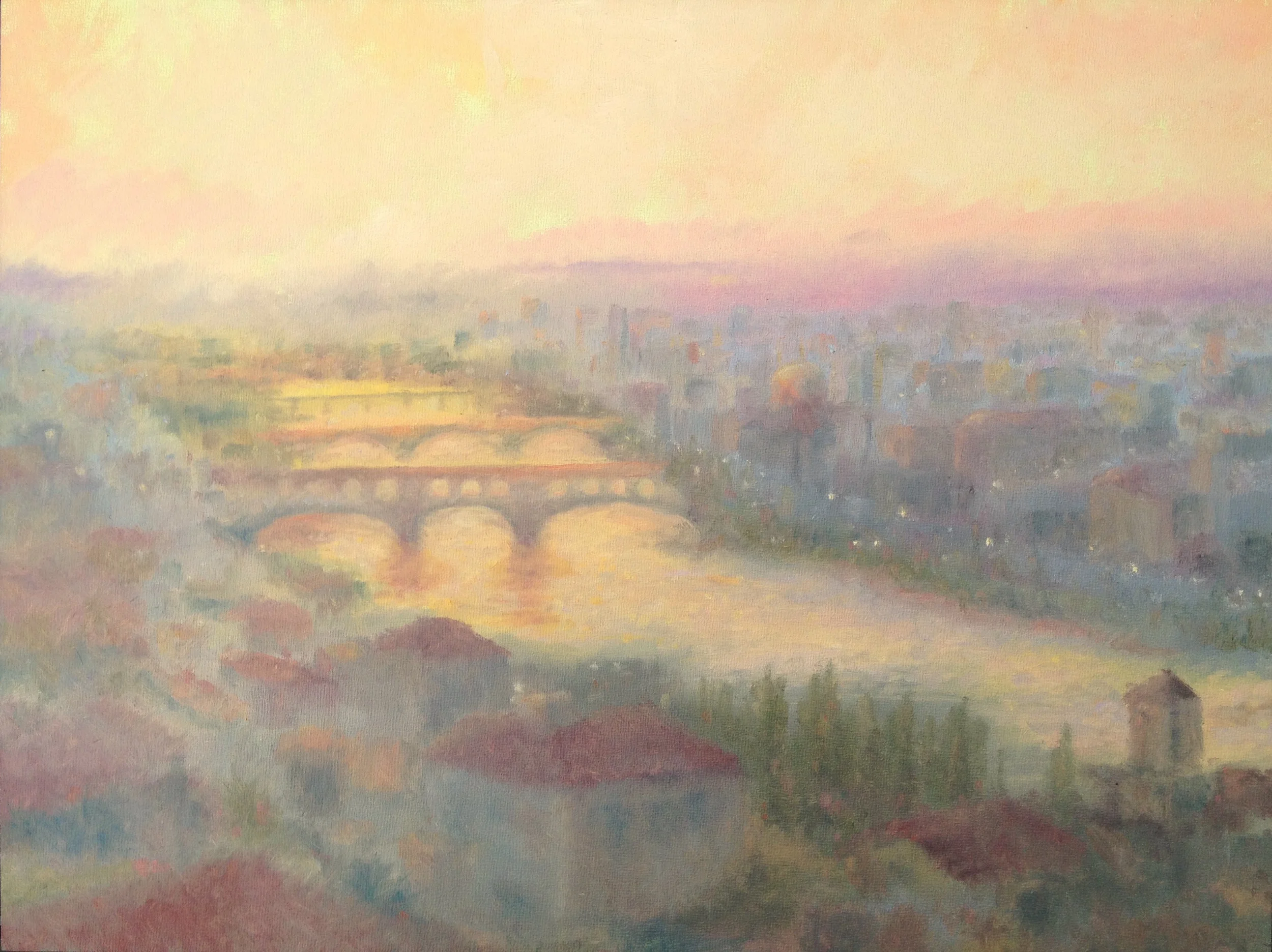 I painted this from two images that I merged together. One image was of the river and bridges, and the other image was of the sky. The image of the sky was used to mostly to develop the color palette.
